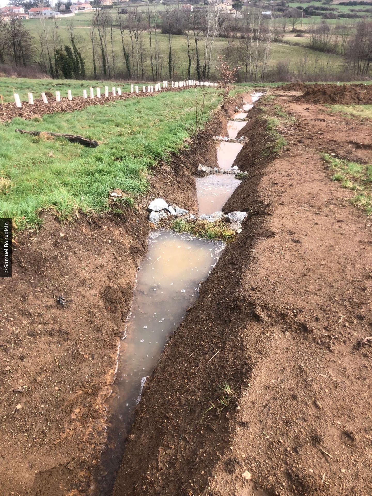 - Het aanleggen van lichte constructies zoals regenwaterkuilen, greppels, wiepen (lage gevlochten wilgenschermen die water afremmen) of redans (getrapte drempels die afstromend water vertragen), vertraagt water en leidt het naar infiltratiezones. Het zijn structuren die makkelijk op perceelsniveau kunnen worden geïntegreerd.