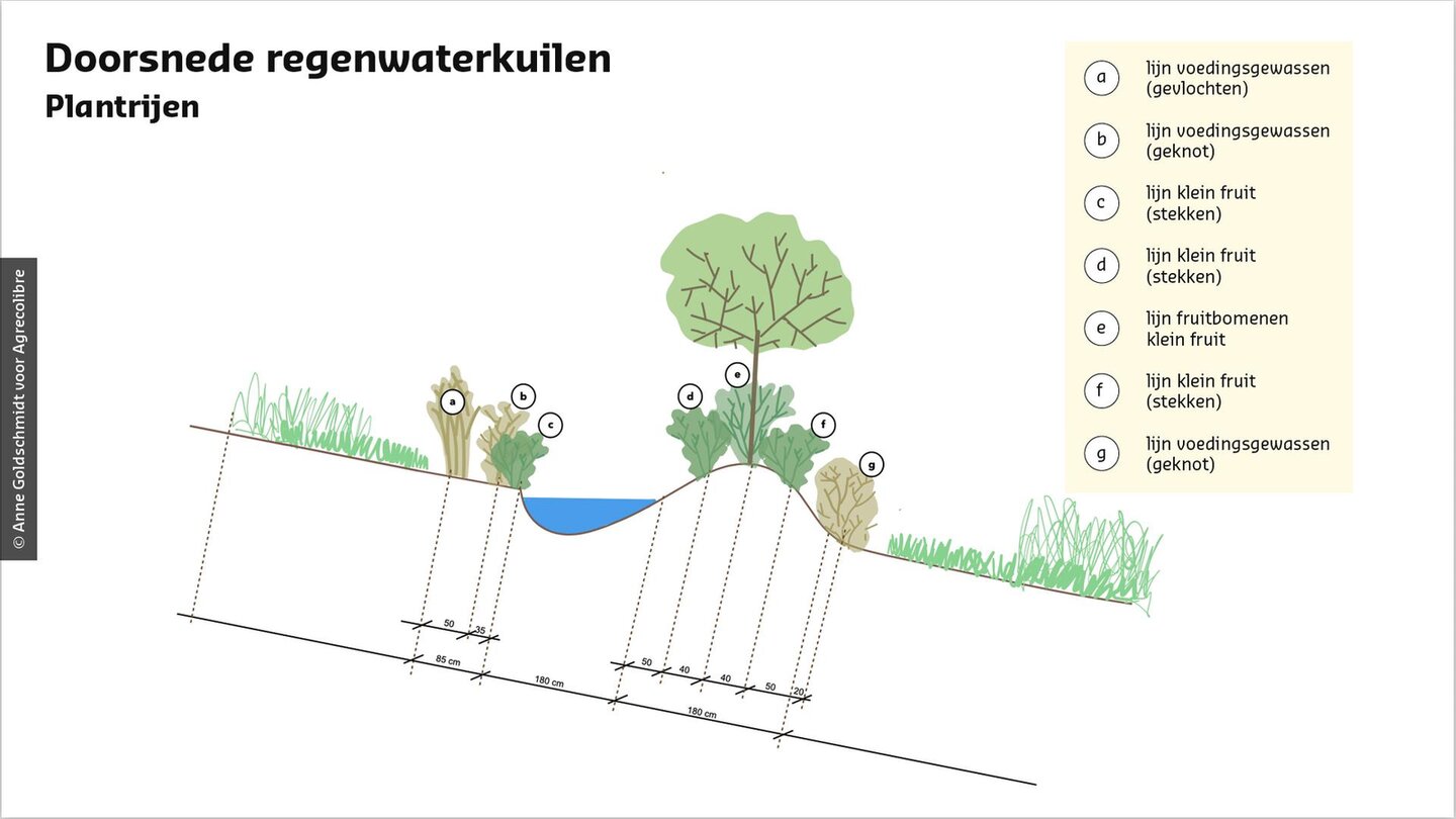 Ontwerpschets voor regenwaterkuilen of gracht-helling-hagen voor de productie van klein fruit op perceelsgrenzen. De lichte ingreep op het bodemreliëf zorgt voor de buffering, herverdeling en infiltratie van water.