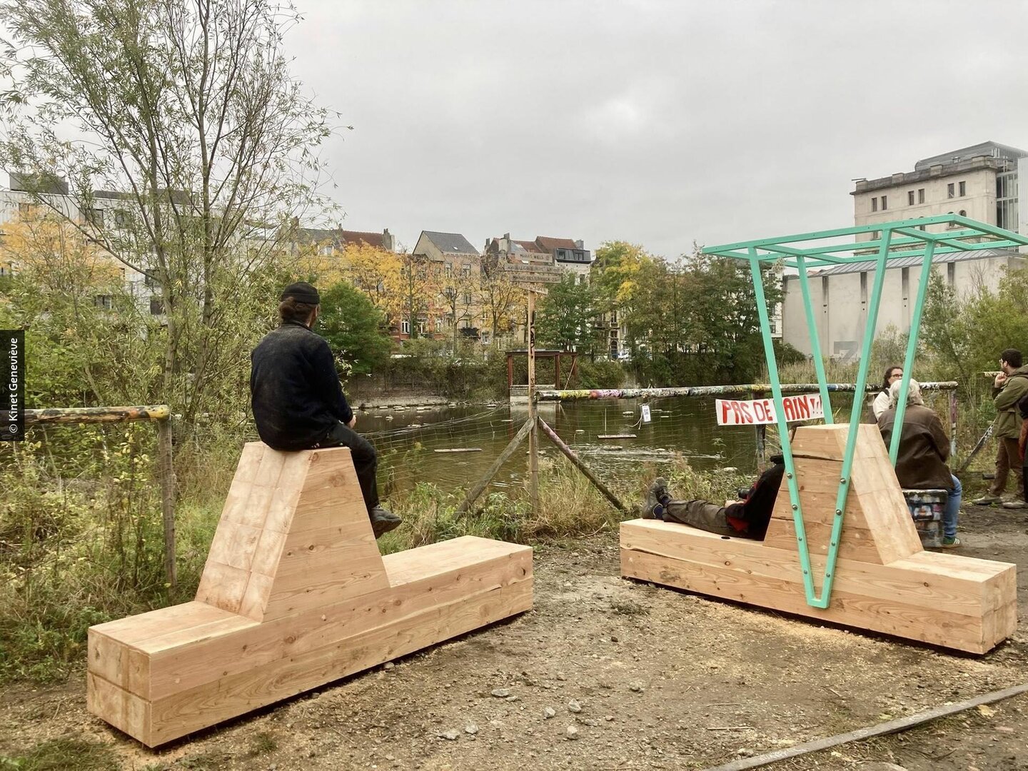 Zitbanken, gemaakt in participatieve ateliers met het collectief van Les Chantiers Battus.