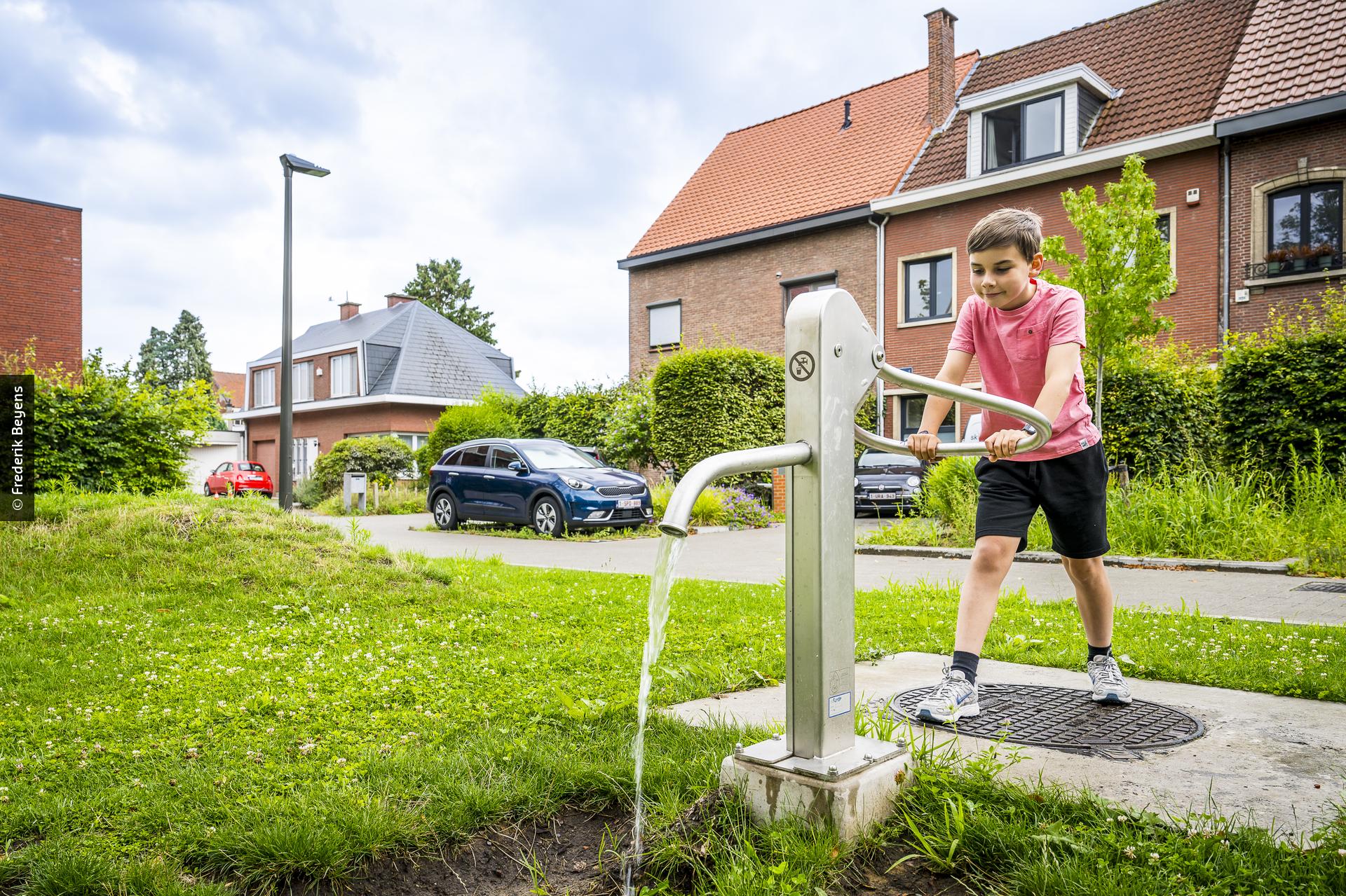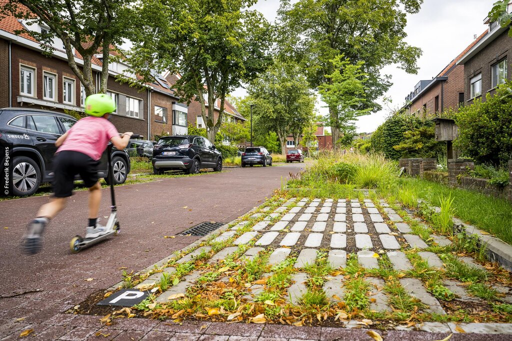 Aan de Tommeltlaan in Mortsel voerde Aquafin enkele quick wins uit. Waterdoorlatende parkeervakken en ontharde zones met groen en bomen vormden de basis. Een nieuw, groen pleintje met een wadi vangt niet alleen regenwater op, maar versmalt ook de rijweg waardoor de snelheid afremt en de veiligheid verhoogt. Onder het centrale groenvak kwam een bufferput voor regenwater. De handpomp op het pleintje zorgt op warme dagen voor waterplezier en verkoeling.