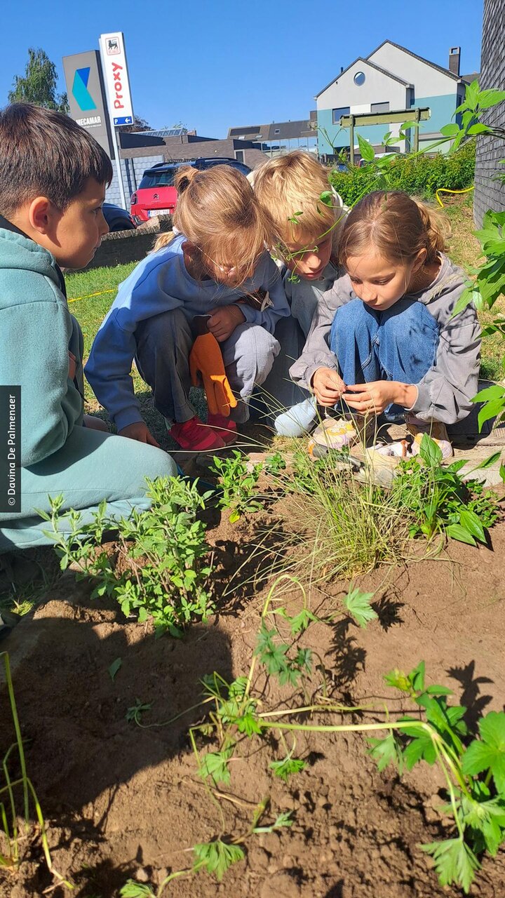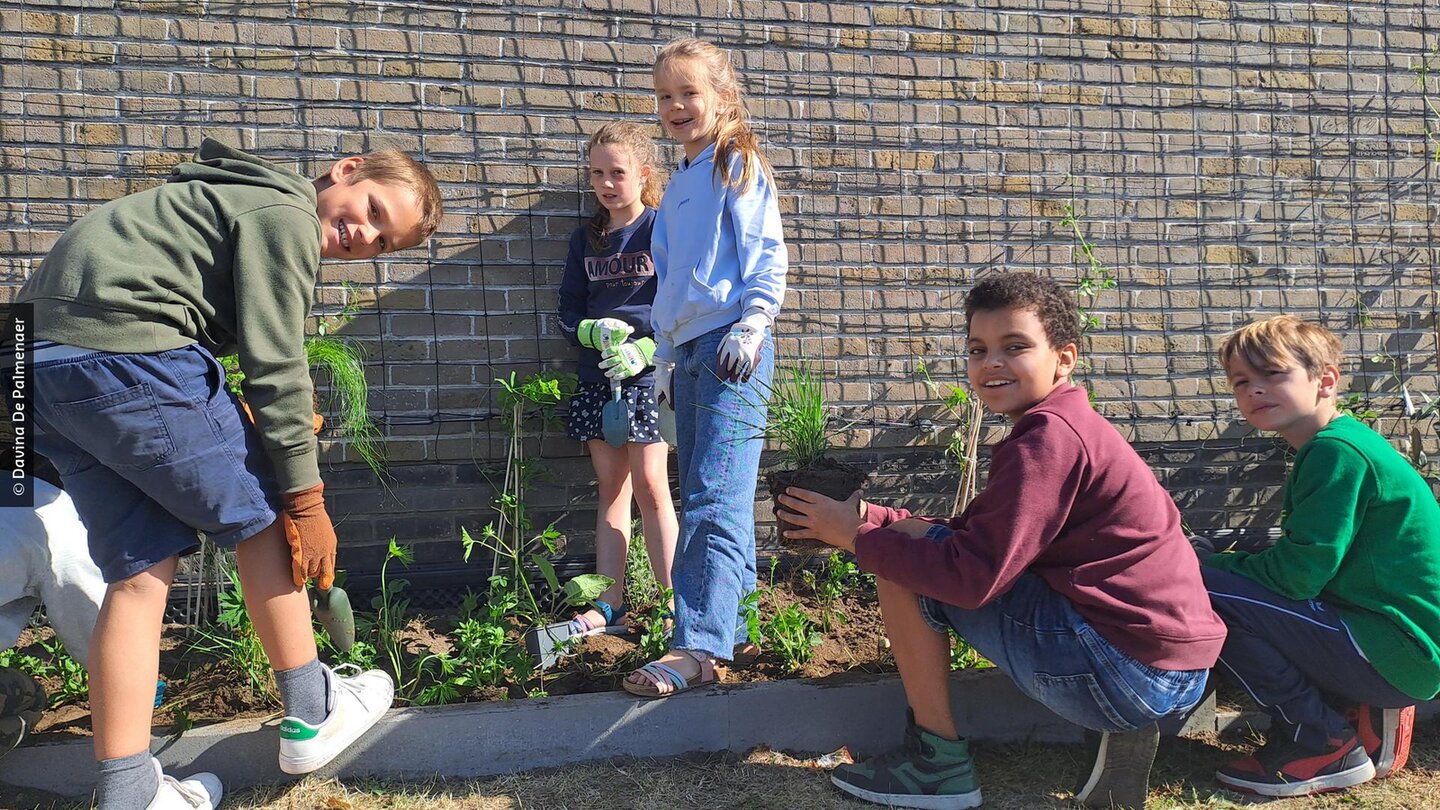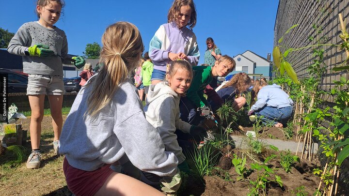 De leerlingen van basisschool De Bosrank kunnen het bevestigen: de temperaturen lopen er vaak hoog op in de zomer. Dat komt omdat de school in het centrum van Zingem ligt. Versteende omgevingen zijn vaak veel warmer als gevolg van de klimaatverandering en ouderen en kinderen zijn extra kwetsbaar voor die hitte. De Provincie Oost-Vlaanderen en de gemeente Kruisem investeren daarom samen in meer gevelgroen op de gemeentelijke gebouwen. Vzw Groene Gevels verzorgde de begeleiding van ontwerp tot ontharding en aanplant. Die aanplant gebeurt dikwijls participatief. Na een lesmoment over groene gevels gingen de leerlingen met kennis van zaken aan de slag met het aanplanten van hun schoolgevel.