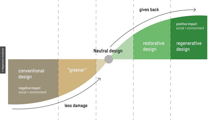 Volgens Pamela Mang en Bill Reed van het Regenesis Institute for Regenerative Practice en Herbert Girardet van de HafenCity University Hamburg betekent regeneratieve ontwikkeling een maatschappelijke verschuiving van het beperken van schade naar het actief teruggeven aan het milieu. Het omvat meerdere niveaus van ecologisch ontwerp.