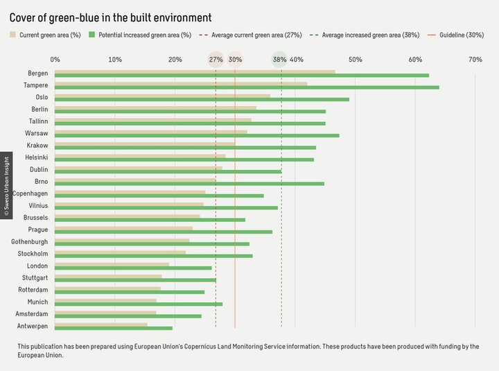 Een studie van Sweco in 22 Europese steden toont echter aan dat de stedelijke groen-blauwe dekking met 42% kan toenemen, wat neerkomt op een uitbreiding van 56.290 hectare binnen de bebouwde omgeving. Door regeneratieve ontwerpprincipes toe te passen, kunnen deze ruimten niet alleen worden uitgebreid, maar dragen we ook bij aan gezondere leefomgevingen voor mensen en aan een grotere diversiteit in de natuur.