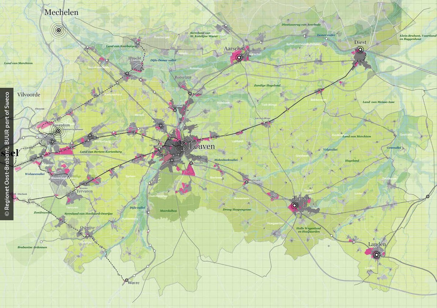 In het kader van het regionale mobiliteitsplan voor Vlaams-Brabant werkten we een overkoepelende mobiliteitsvisie uit onder de noemer Regionet Oost-Brabant. Regionet vormt de basis voor het Regionaal Mobiliteitsplan van de Vervoerregio Leuven en vertrekt vanuit een geïntegreerde benadering van mobiliteit en ruimtelijke ontwikkeling, sterke OV-assen als ruggengraat, ondersteund door fijnmazige fietsnetwerken en multimodale knooppunten. Door in te zetten op knoopgerichte ontwikkeling en duurzame vervoersmodi laten we ruimte voor de regeneratie van menselijke en natuurlijke systemen. Het vergroot de bereikbaarheid van kernen, vermindert het de verkeersdruk en draagt het bij aan een klimaatrobuuste en samenhangende regio .