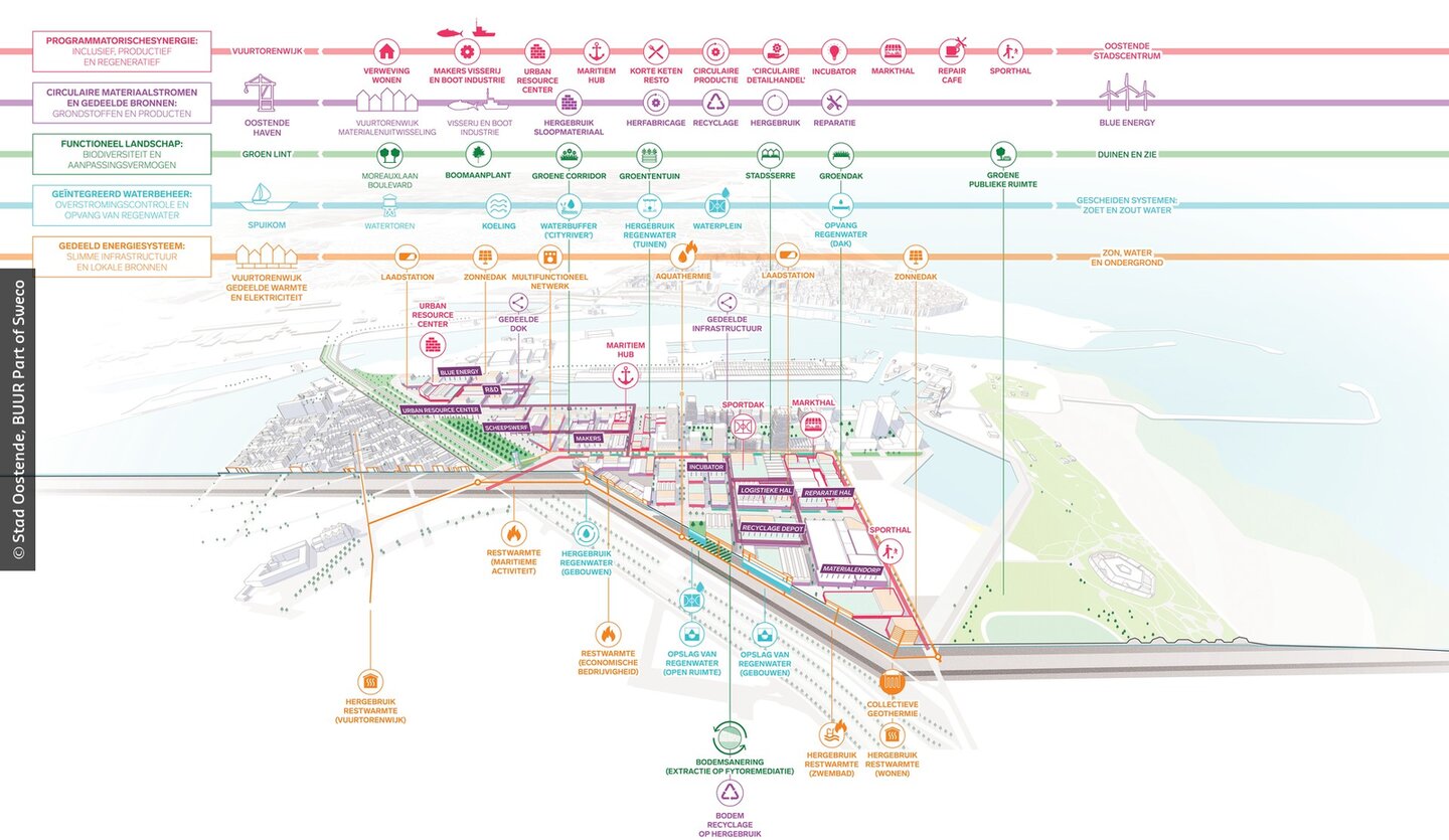 Het oude havengebied van Oostende is in transformatie en het Oosteroever-project gebruikt de kringloopprincipes vroegtijdig in het ontwerpproces om randvoorwaarden en synergiën bij alle stakeholder te identificeren. Daardoor zijn de regeneratieve principes structureel verankerd in de gehanteerde procesaanpak.