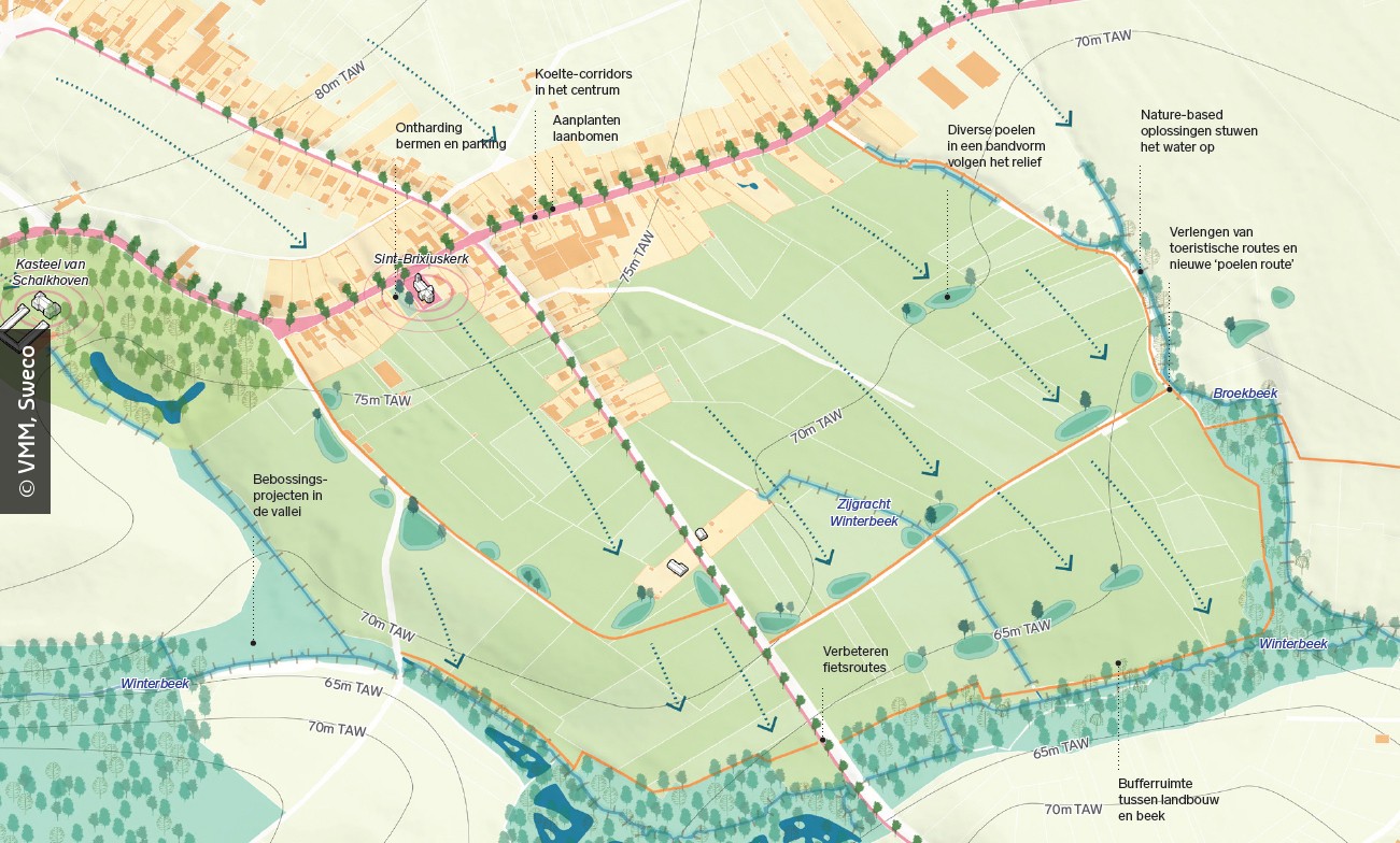 Een risico-gebaseerd en natuurkrachtig actieplan vormt de basis voor regeneratieve stedelijke transformatie. Een adaptatieproces start met het inschatten van risico’s op basis van blootstelling, kwetsbaarheid en ernst. In een klimaatadaptatiescan, zoals in Bilzen- Hoeselt , wordt niet alleen gekeken naar wateroverlast, hitte en droogte, maar ook naar de specifieke kwetsbaarheid van bevolkingsgroepen en ecotopen. Regeneratieve adaptatieplannen, zoals in het Groenplan Leuven , bouwen voort op de eigen natuurkracht.
