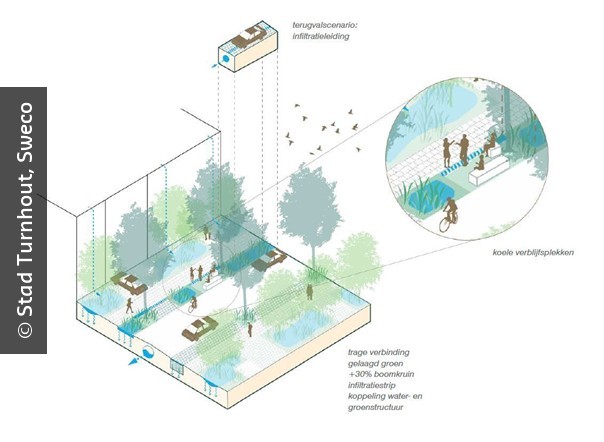 In Turnhout groeide het herstel van het blauw-groene netwerk vanuit onderzoek, dat aantoonde hoe het oorspronkelijke stratenpatroon inspeelde op de microtopografie en natuurlijke afstromingsgebieden in de publieke ruimte. Het Integraal Groen- en Waterplan (IGWP) bouwt hierop verder en herstelt de synergie tussen sociale structuren en ecologische systemen — van bron- en kwelzones tot microreliëf en ondergrond. Met focus op het centrum en de stedelijke wijken vertaalt het plan de rol van publieke en private ruimte binnen het groenblauwe netwerk naar een concrete leidraad voor de stadsdiensten.