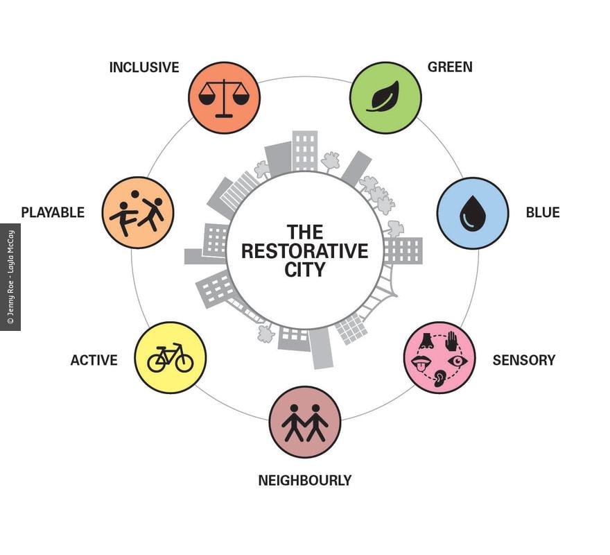 Restorative City Framework, uit het boek ‘Restorative Cities: Urban Design for Mental Health and Wellbeing’ (Jenny Roe and Layla McCay, 2021)