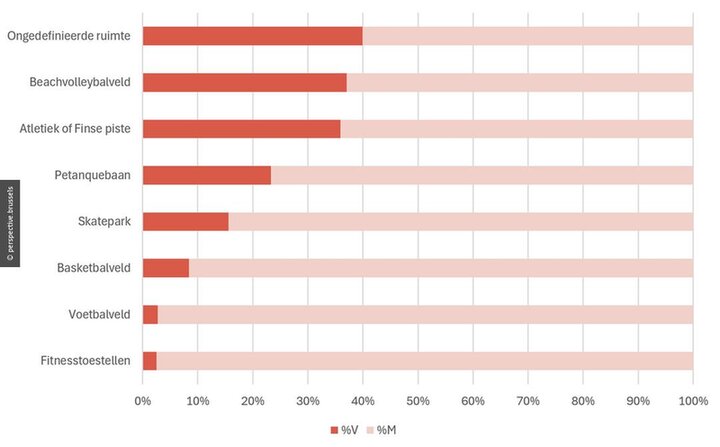 Het Brussels Gewest telt bijna 600 vrije sportfaciliteiten en die worden door een overwegend mannelijk publiek gebruikt. Dat blijkt uit een bevraging door perspective.brussels, het expertisecentrum voor de ruimtelijke ordening van het Gewest. Ongeveer 1 op 5 van de gebruikers van deze sportfaciliteiten is vrouw, al verschilt het beeld naargelang de voorziening in kwestie en de manier waarop ze is ingericht.