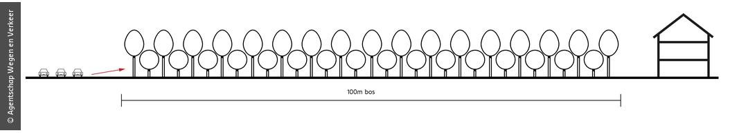 Om een geluidsreducerend effect (ongeveer 3 tot maximaal 5 dB(A)) te bekomen, is een dicht bos van minstens 100 m diep naast de af te schermen weg noodzakelijk. Dit betekent een bos met een afwisseling van hoge en lage bomen en struiken, waardoor - op alle niveaus - slechts enkele meters ver kan worden gekeken. Beplanting over een beperkte diepte houdt fysisch geen geluid tegen. Toch kan verkeersgeluid, wanneer men de bron aan het zicht onttrekt, minder hinderlijk klinken.